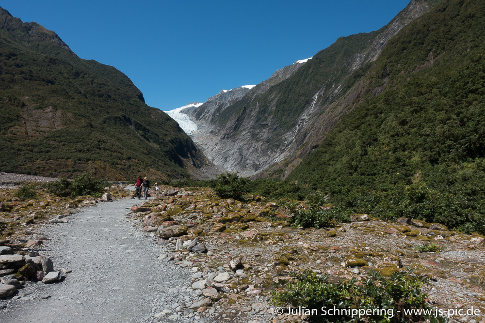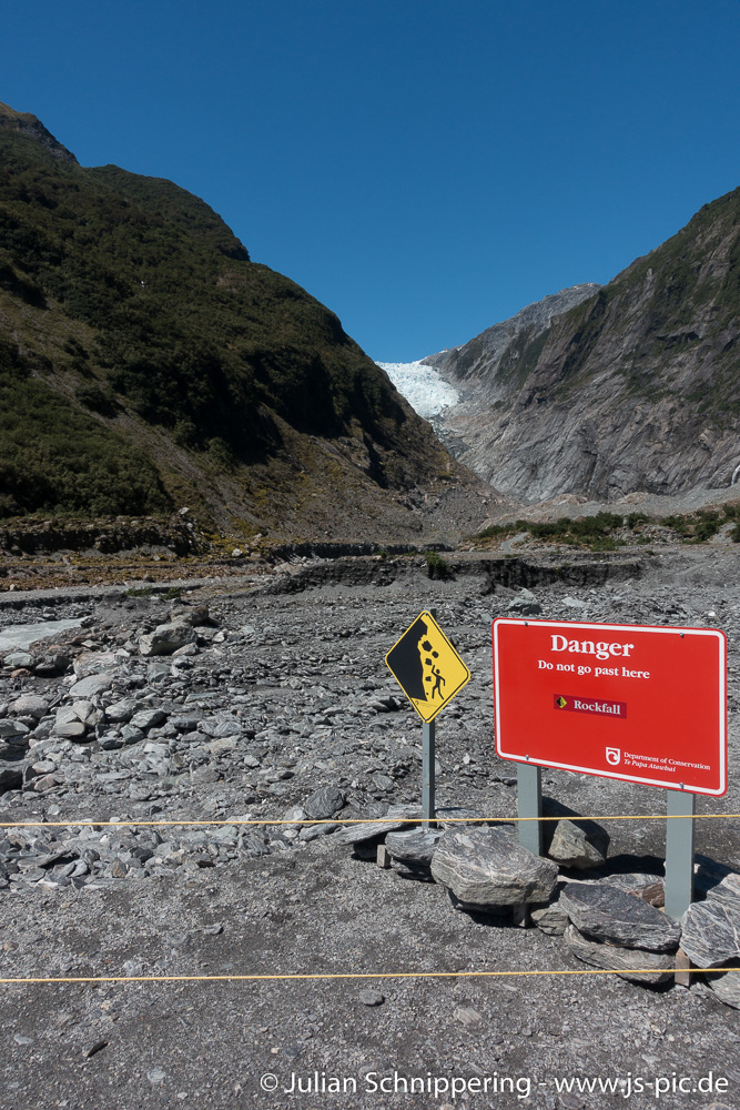 Ein Weg durchs Tal führte einen so nah an den Gletscher wie es gefahrlos möglich war, erst 2 Tage zuvor ist ein Stück des Berges in das Tal gestürzt, sodass der Weg noch als unsicher eingestuft wurde.