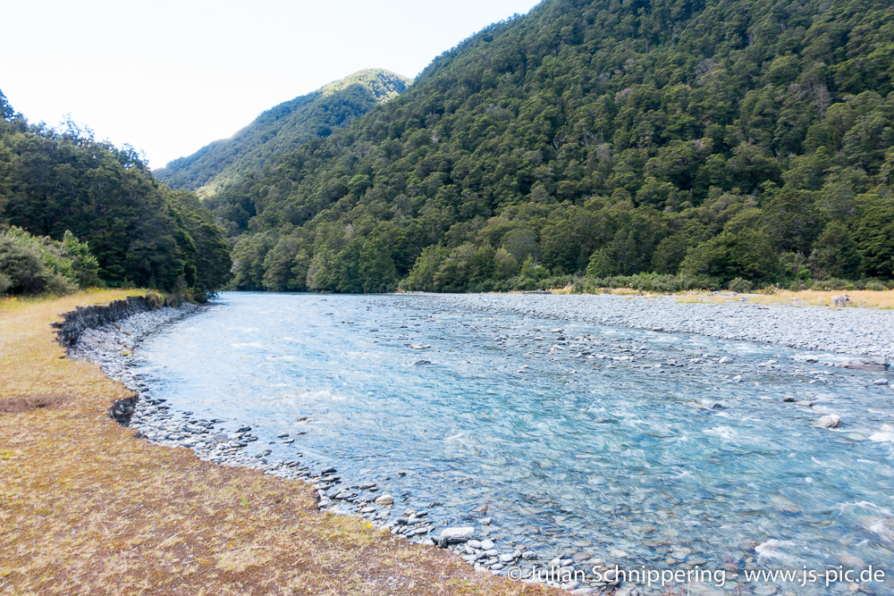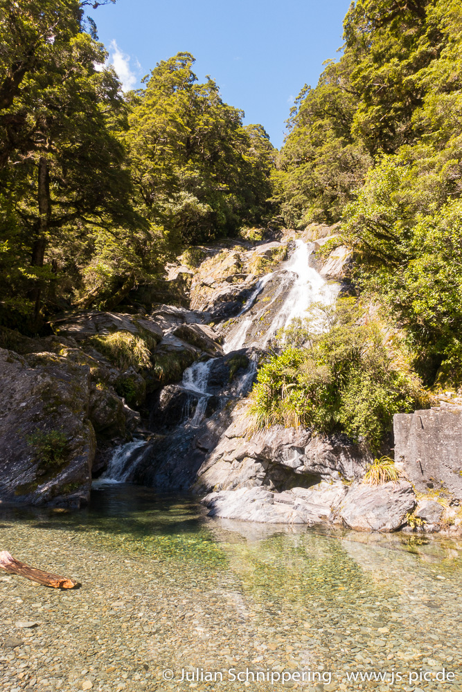 Weiter ging es zu den Fantail Falls. Das Wasser kam ebenfalls aus einem Gletscher, sodass es eine ähnliche blau Färbung und Temperatur hatte, wie die Blue Pools. Durch den Fluss konnte man bis direkt an den Wasserfall, einfach unglaublich schön mit dieser traumhaften Kulisse.