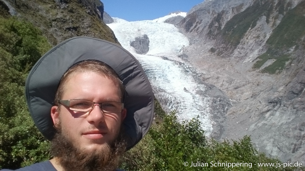 Am nächsten Morgen strahlte die Sonne, der Himmel war blau und wolkenlos. Gegen 9 Uhr erreichten wir den Franz Josef Gletscher. Schon vom Parkplatz aus konnte man die mit Schnee bedeckten Bergspitzen sehen.