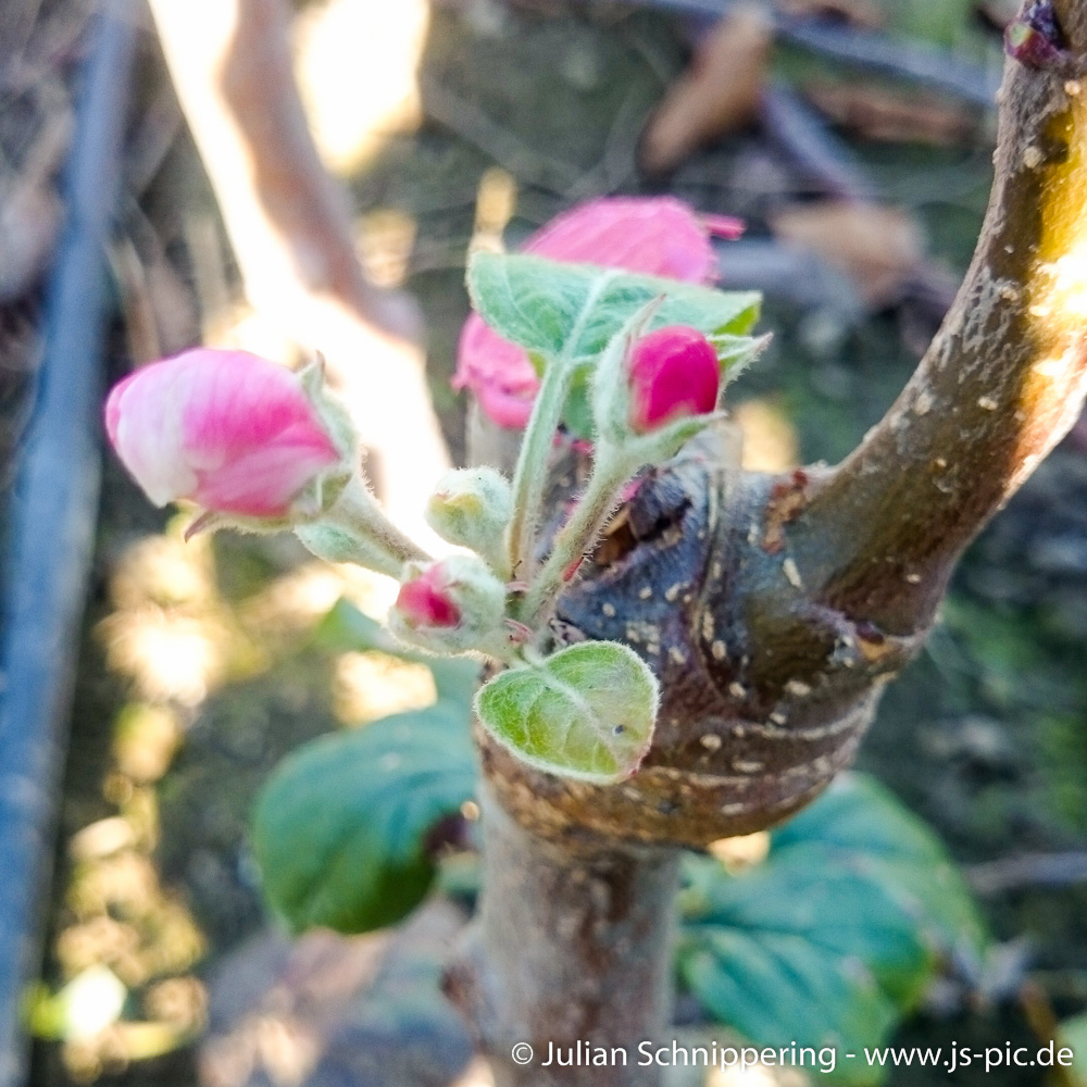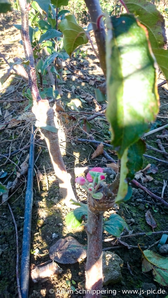 Im Frühling werden kleine Stämme gepflanzt und gezogen, die tiefe Wurzeln ausbilden, ein Jahr später wird dieser mit einem Zweig von einem Apfelbaum veredelt. Dieser Hybrid wächst dann ein weiteres Jahr bis er mit 2 Jahren ausgegraben und verkauft wird. Bei der Veredelung wird ein Schnitt in den Stamm gemacht, der Zweig hineingesteckt und festgetapet. Da der Stamm nicht weiter wachsen soll, sondern der gesetzte Zweig, wird jener gestutzt. Das war unsere Aufgabe. Auf das frischgeschnittene Ende kam ein antibakterieller Anstrich um den Baum vor Krankheiten zu schützen.