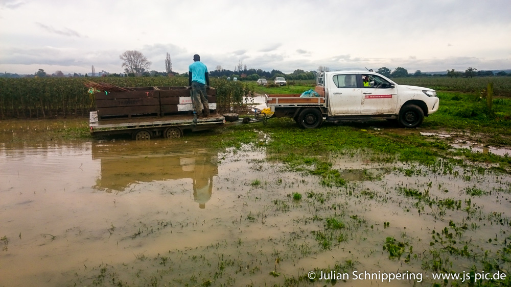 Über Nacht hatte es nicht aufgehört zu regnen und auch am Morgen hielt der Regen an. Die Felder standen komplett unter Wasser, zum Teil knietief. Überall hatten sich Seen gebildet und diverse Farmautos haben sich festgefahren. In voller Regenmonteur hatten wir unseren Spaß, sind durch Pfützen gesprungen und durch den Schlamm geslidet.