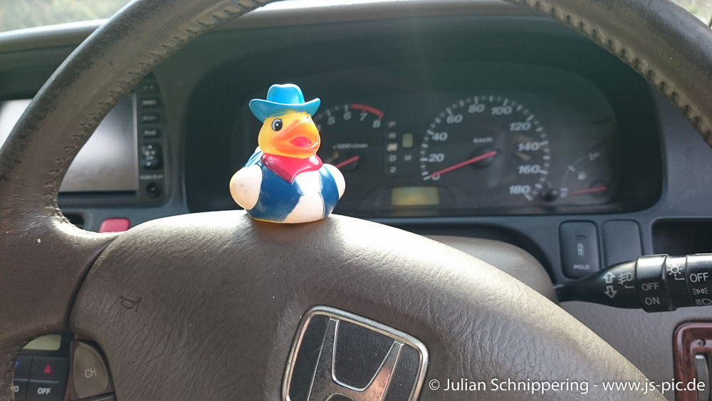 | Entchen Fiona und ihre erste Fahrstunde im neuen Honda. |