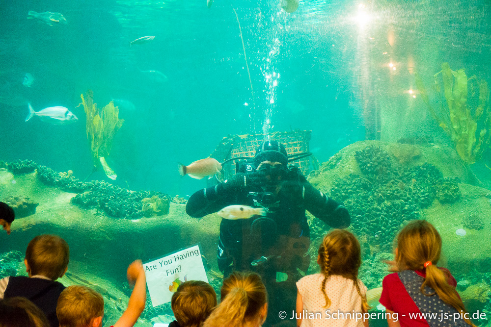 Nach dem wir auch die zweite Fütterung der Pinguine gesehen hatten, wurden um 14 Uhr die Haie gefüttert. In einem Tunnel konnte man direkt unter den Fischen, Haien und Stachelrochen stehen und dem Taucher erneut beim Füttern zusehen.