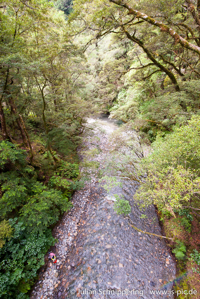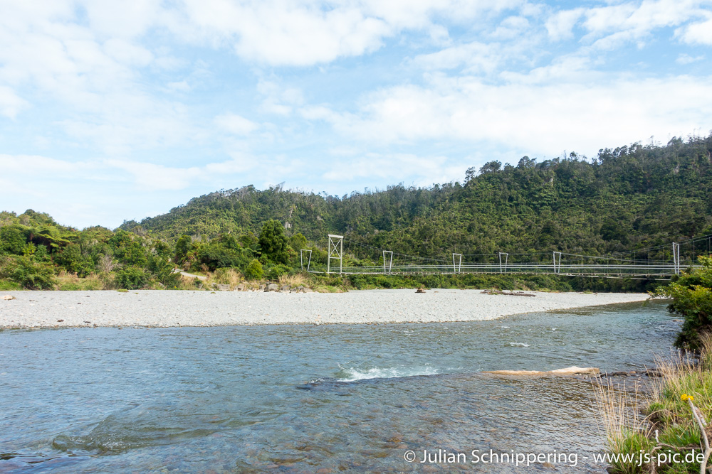 Unseren nächsten Stop haben wir an einer Hängebrücke gemacht die ca 30m über einem Fluss hängt. Unten am Ufer haben wir einen Goldgräber gesehen – die Region an der Westküste hat noch einige Stellen an denen das Schürfen nach Gold erlaubt und sogar erfolgversprechend ist!