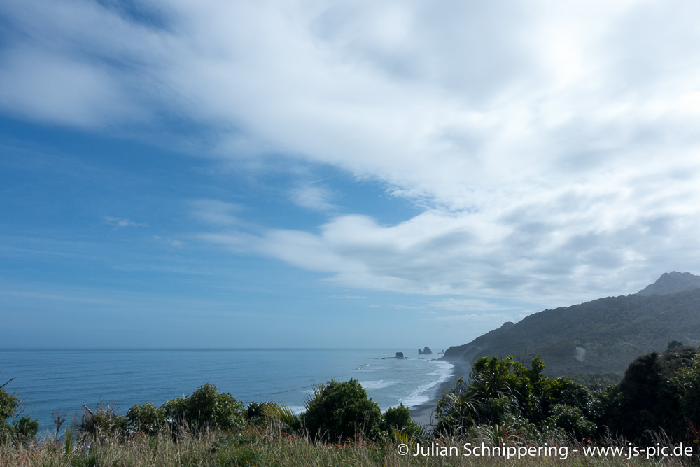 Die Nacht wollten wir im Punakaiki Beach Camp verbringen, denn kostenlose Campingplatz gibt es hier kaum. Beim Einchecken haben wir erfahren, dass die nur 1km entfernten Pancake Rocks bei Flut wirklich beeindruckend sein sollen und dass gerade Flut sei. Dieses Spektakel wollten wir uns natürlich nicht entgehen lassen und so sind wir zu den Pancake Rocks gefahren. Ein wirklich schön gemachter Weg führt an den seltsam anmutenden Steinformationen entlang und bietet eine fantastische Sicht über das Meer und die Wellen.