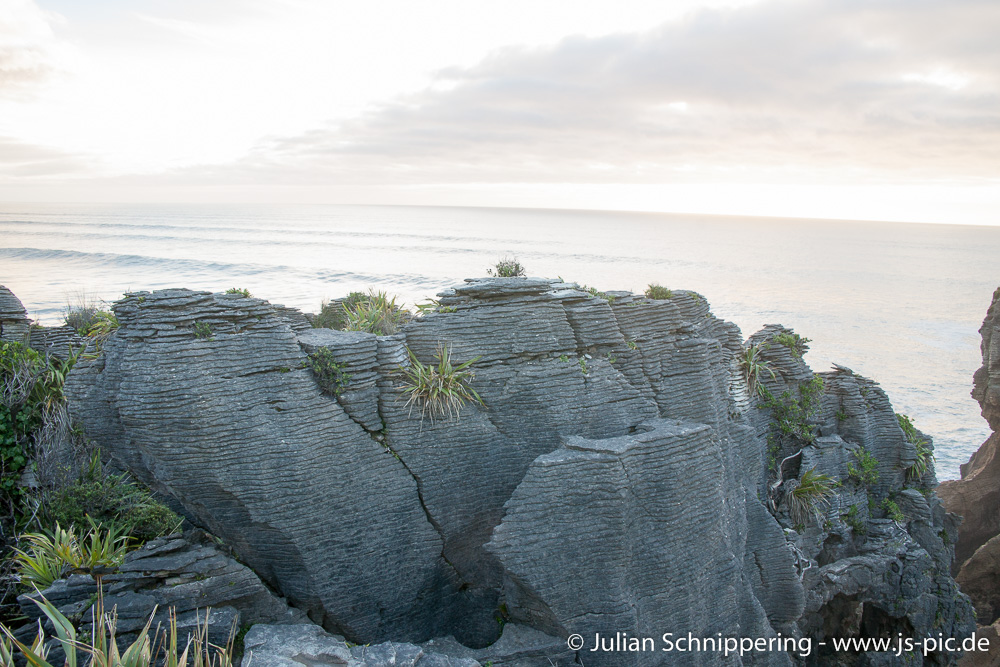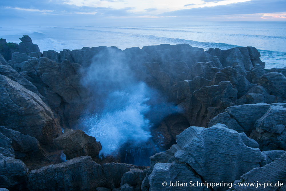 Einige dieser Pancake Rocks haben so genannte „blowholes“, bei Flut läuft das Wasser durch diese durch und spritzt bis zu 30m hoch! Wirklich beeindruckenden und bei Sonnenuntergang gang besonders schön.