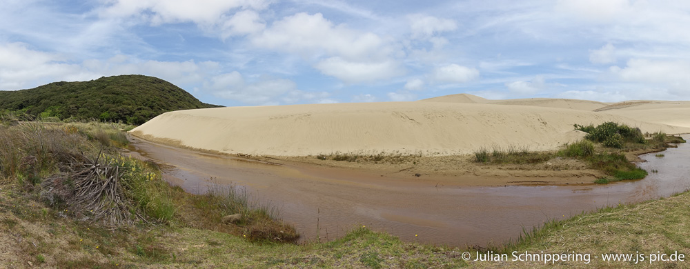 Vom Cape aus sind wir zurück gen Süden gefahren. An der Giant Te Paki Sanddune (gigantische Te Paki Sanddüne) haben wir noch einen kurzen Zwischenstop eingelegt und haben uns sowohl die verrückten Sandboarder, als auch den Eingang durch den Te Paki Stream (Te Paki Fluss) angeschaut. Die Dünen sind riesig und echt hoch, das Sandboarden sah ziemlich verrückt aus, allerdings haben wir uns dann dagegen entschieden weil wir doch nicht so verrückt waren.