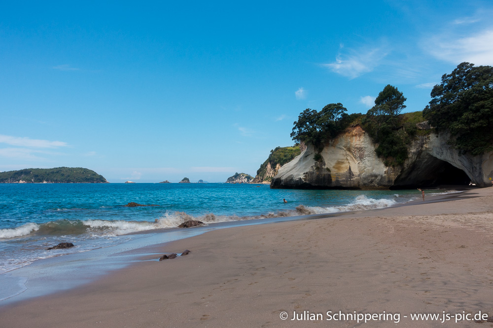 Den nächsten Morgen haben wir es genossen an einem Tisch frühstücken zu können, sonst essen wir in der Regel auf dem Boden sitzend oder mit etwas Glück auf einer Wiese. Gestärkt haben wir uns auf den Weg zu Cathedral Coves gemacht. Hier gab es 3 Walks die zu je einer Bucht geführt haben. Der Hauptweg führte vom Parkplatz zu Cathedral Cove, vorbei an Stingray Bay und Gem Stone Bay. Wir beschlossen die Abstecher zu den anderen Buchten auf dem Rückweg zu machen und sind die 45 Minuten zu Cathedral Coves losgewandert. Nach einem wirklich schönen Walk kamen wir dann an der ersten Bucht an, welche durch einen Tunnel im Felsen von einer zweiten Bucht getrennt ist.