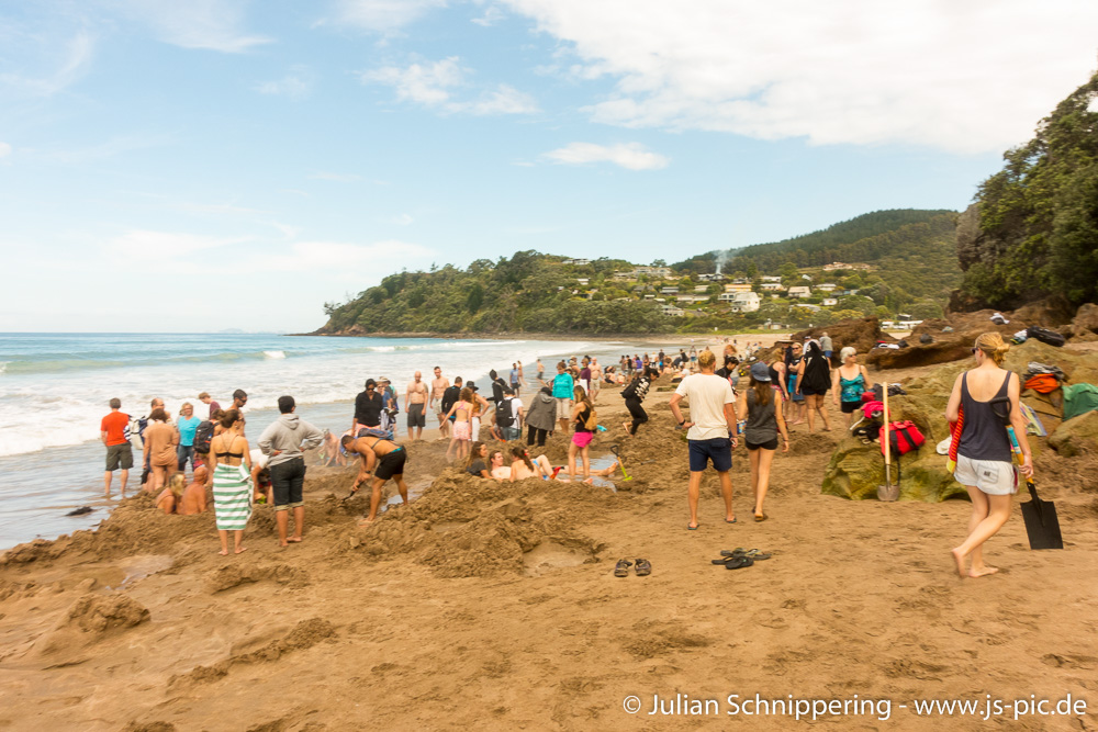 Die Gemstonebay lag weitere 5 Minuten entfernt, bestand aber leider nur aus kleinen, großen und noch größeren Steinen. Also ging es zurück zum Auto und auf zum nicht weit entfernten Hot Water Beach. Bei Ebbe kann man hier ein Loch in den Strand buddeln und dank einer geologischen Besonderheit sprudelt heißes Wasser hervor. Wir haben es rechtzeitig zur Ebbe geschafft und konnten uns das lustige Treiben dieser Menschenmenge anschauen.
