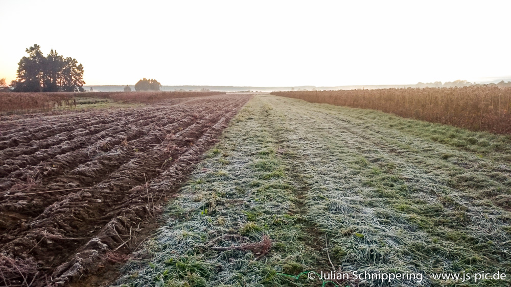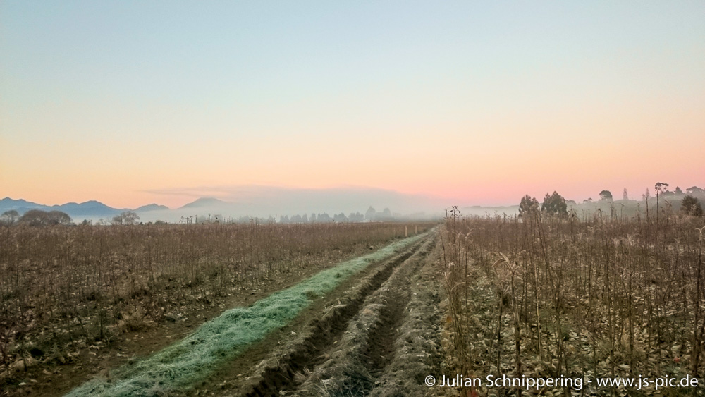 Dank des langen Wochenendes hatten wir unseren ersten Arbeitstag der Woche erst am Dienstag. Um 7:30 Uhr ging es los mit der Ernte der Apfelbäume. Über Nacht hatte es leicht gefroren sodass die Wiese bedeckt von einer Schicht Raureif war, die in der aufgehenden Sonne zu glitzern begann. Der Himmel färbe sich wie jeden Morgen in den intensivsten rot Tönen des Sonnenaufgangs. Und mit den ersten wärmenden Sonnenstrahlen taute nicht nur der Frost, sondern auch wir auf.
