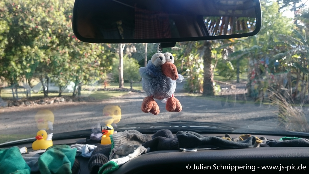 Donnerstag haben wir erst auf dem Feld gearbeitet, danach hatten wir einen Termin mit der Bank in Kaitaia um ein Bankkonto für meine Freundin zu eröffnen. Lustigerweise hat natürlich die Kundenhotline den Termin nicht eingetragen, deswegen mussten wir ein paar Minuten warten. Dann aber ging es flott und 30 Minuten später hatten wir ein zweites Konto und konnten mit diesem Konto dann auch direkt die IRD Nummer (Neuseeländische Steuernummer) beantragen. Auf diese Nummer müssen wir jetzt noch 1-2 Wochen warten. Dann kann Sie endlich auch legal ihr Gehalt bekommen. Abends haben wir unser neues Maskottchen im Auto befestigt. Frisch eingetroffen aus Deutschland, reist ab jetzt mit uns durch Neuseeland.