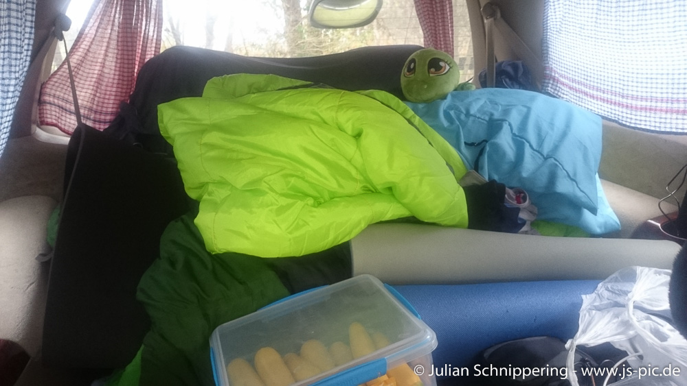 | Ordnung im Auto. 2 Schlafsäcke, Isomatten und meine tollen Vorhänge. |