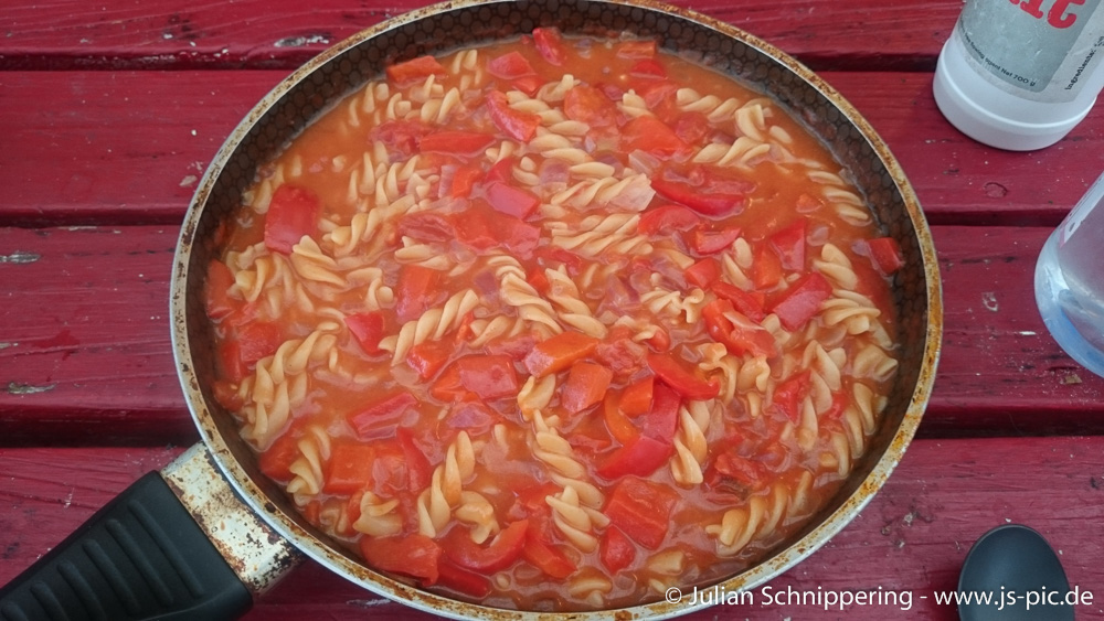 Falls du Zwiebeln und/oder Knoblauch verwenden willst, solltest du diese kurz (2-3 Minuten) in etwas Öl anschwitzen. Danach gibst du die Nudeln mit der Tomatensauce dazu, verrührst einmal alles kurz und füllst dann soviel Wasser auf, bis die Nudeln vom Wasser bedeckt sind. Wenn du zusätzlich Gemüse verwenden willst, kannst du dieses gewürfelt mit zu den Nudeln geben. (Je härter das Gemüse, desto kleiner solltest du es schneiden damit es in etwa die gleiche Garzeit hat wie der Rest des Essens.) Etwas Salz, Pfeffer und wenn du hast eine Prise Zucker (Lebensmittel die eine gewisse Säure haben wie zB. Tomaten, schmecken mit etwas Zucker intensiver!) dazu. Jetzt lässt du alles mit Deckel köcheln bis das Wasser verkocht ist. Zwischendurch immer mal wieder umrühren. Sollten die Nudeln noch zu hart sein einfach noch etwas Wasser ergänzen. Nach ca. 10 Minuten sollte alles fertig sein. Guten Appetit.