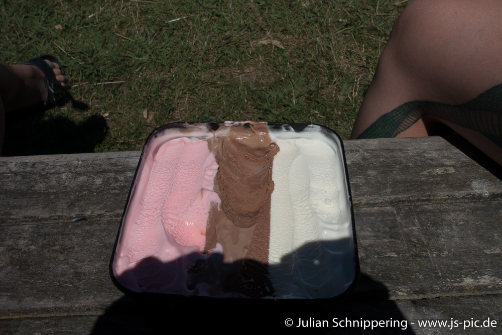 Am Montag morgen kam uns eine Freundin besuchen, mit der wir in Whangarei gewandert sind. Der Tag war unglaublich warm und sonnig, perfekt für einen Besuch am Strand. Wir sind erneut zum Schiffswrack gefahren, da unsere Freundin dieses noch nicht gesehen hatte. Mit einem großen Becher Eis ließ sich die Sonne dann gut ertragen.