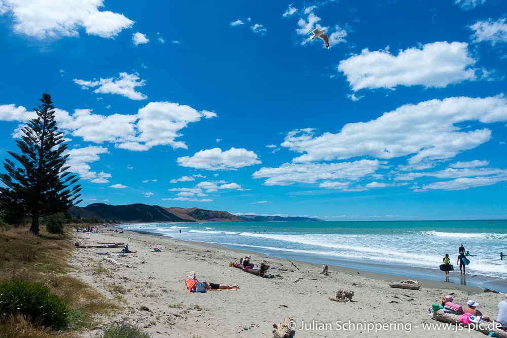 Als der Farmers Market um 12:30 Uhr schloss, haben wir beschlossen den Tag am Waimarama Beach zu verbringen. Ein lang gezogener Strand mit weißem, weichen Sand und türkis bis dunkel blauem Meer. Die Wellen waren super zum surfen und das sonnig warme Wetter lud zu einem Sonnenbad ein.