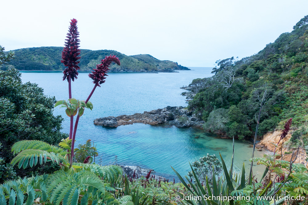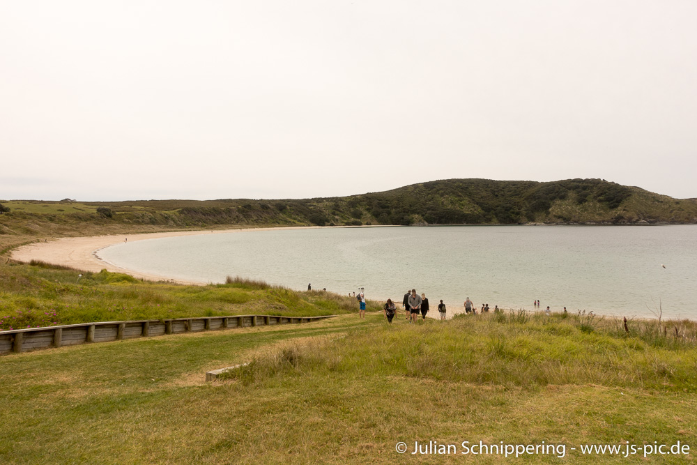 Nachdem ich den Vormittag gearbeitet habe, Blogeinträge vorbereiten, Fotos sortieren und Sicherungen erstellen sowie Emails lesen und beantworten, haben wir Mittags beschlossen das wir gerne zum Strand möchten. Da ich hier in der Gegend den 90 Mile Beach mittlerweile oft genug gesehen habe, haben wir zusammen beschlossen, das wir zum 60km von Ahipara entfernten, Maitai Bay fahren. Das ist eine malerische Bucht und ein traumhaft schöner Platz bei gutem Wetter. Auch ein schöner D.O.C. Campingplatz ist hier direkt, nur ein kurzes Stück vom Wasser entfernt, angelegt.