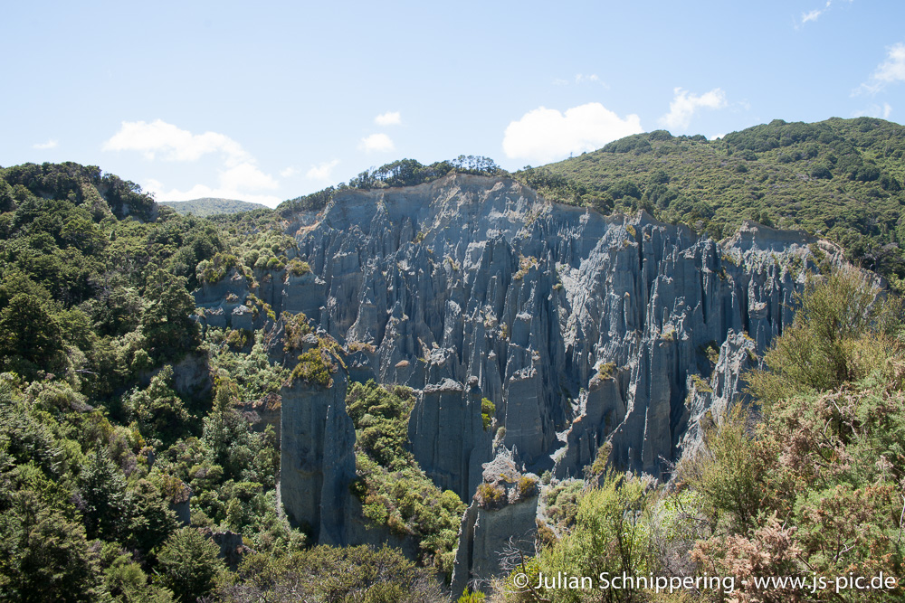 In der Nacht frischte der Wind auf und ließ uns kaum schlafen. Windgeschwindigkeiten von bis zu 60km/h rüttelten an unserem Auto und ließen die Gischt gegen dieses peitschen. Zum morgen hin wurde es stiller, der graue Himmel brach auf und die Sonne kam zum Vorschein. Gute Voraussetzungen um zu den Putangirua Pinnacles zu wandern. Wir entschieden uns für den Lookout, der in etwa 45 Minuten zu erreichen war.