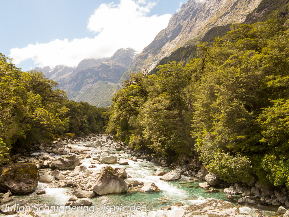 Auf dem Rückweg durch die Berge vom Milford Sound aus haben wir noch wunderschöne Impressionen gehabt. Riesig hohe Berge und beeindruckende Schmelzwasserbäche, alles in allem einfach wunderschöne Alpine Eindrücke.