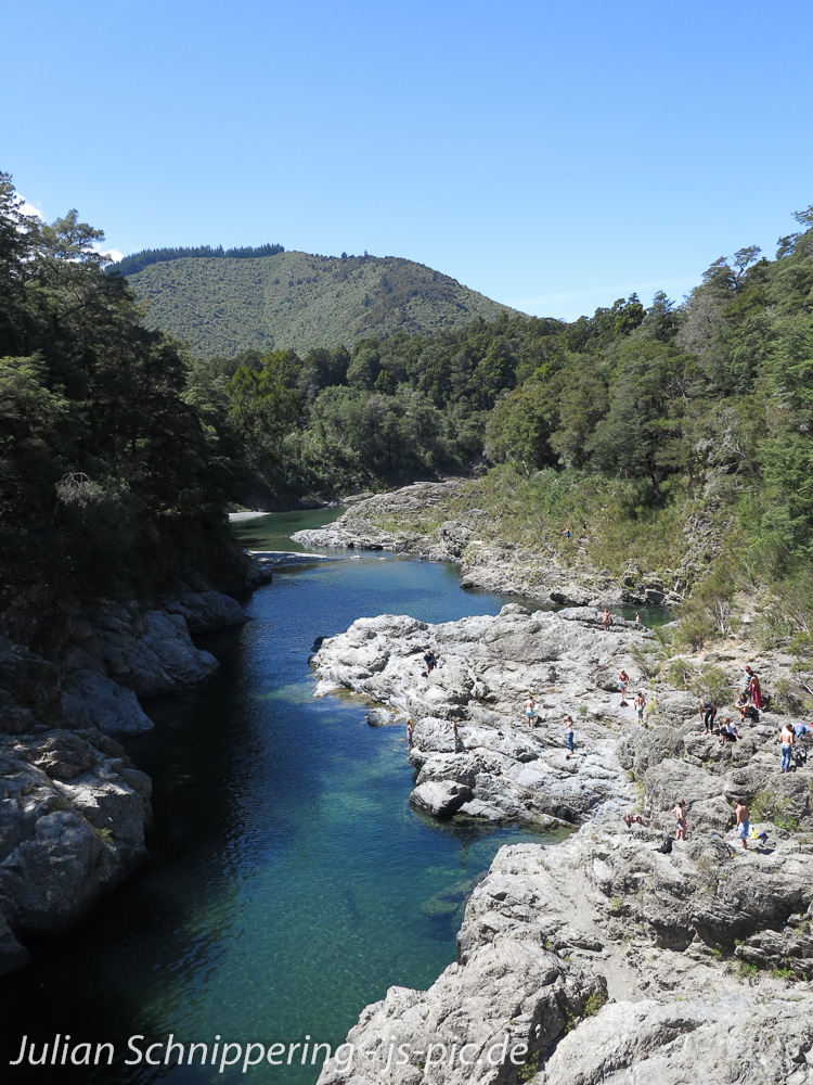 Einen kurzen Stop haben wir noch an der Pelorus Fluss Brücke gemacht, dort gibt es immer wieder verrückte Leute die ihren Mut mit einem Sprung von der Brücke beweisen wollen. Leider gibt es dort auch immer wieder verletzte, also schaut es euch an, aber springt nicht.