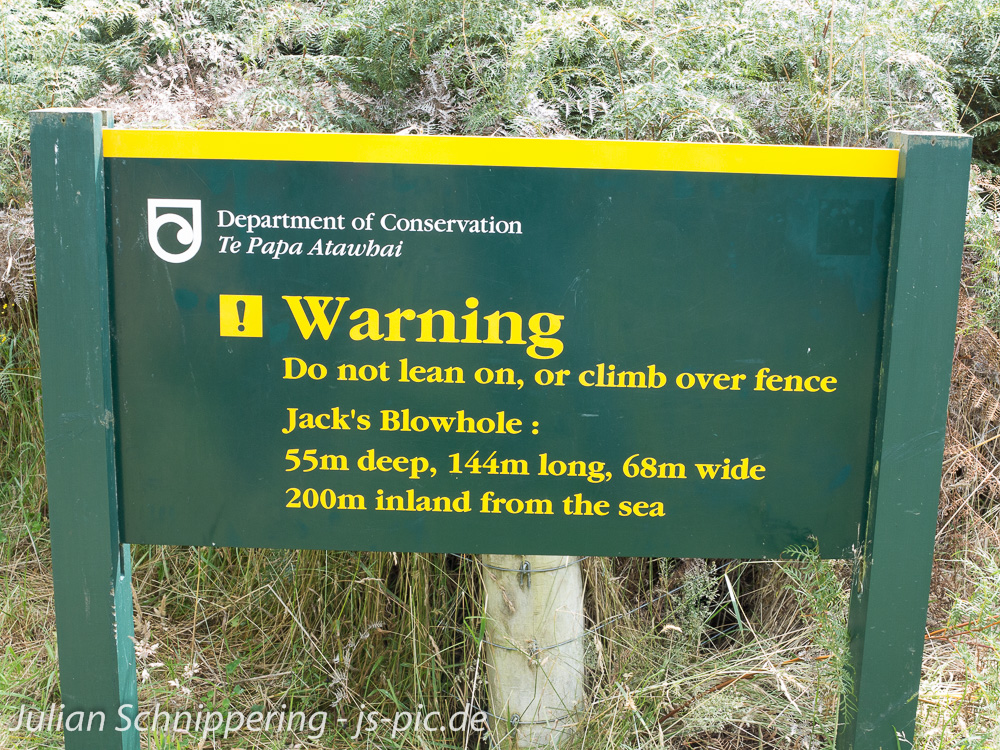 Vom Nugget Point aus ging es ein ganzes Stück den selben Weg zurück wie wir auch mit dem Auto gekommen sind. Das nächste Ziel was wir uns anschauen wollten war Jack’s Blowhole. Ein tiefes Loch im Landesinneren, ca. 200m vom Meer weg und ziemlich tief. Dank eines Holzbalkons den die findige Tourismusförderung dort gebaut hat kann man sogar hervorragend herunter gucken. Echt ziemlich beeindruckend was die Natur so baut.
