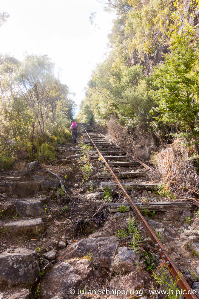 Zurück zum Auto war für uns beide keine Option, also trotzdem frohen Mutes und nassen Fußes weiter. Die 3 Stunden auf dem Billy Goat Walk waren verdammt anstrengend. Die Wege waren uneben, es gab sehr steile Anstiege die zum Teil sehr rutschig waren, steile Treppen und matschigen Waldboden. Uns beschlich sehr bald das Gefühl, dass Billy eine Ziege gewesen sein muss, anders sind soviel Stein und Fels nicht zu erklären, geschweige denn zu erklimmen. „Billy the goat Track“ wäre wohl der passendere Name gewesen. Doch der Weg führte uns auch an sehr interessante Stellen, wie z.B. an die alten Schienen der Waldarbeiter oder den höchsten Wasserfall der Nordinsel.