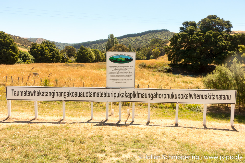 Unseren ersten Stopp haben wir zwischen Porangahau und Wimbledon eingelegt, am längsten Ortsnamen der Welt! Taumatawhakatangihangakoauauotamateaturipukakapikimaungahoronukupokaiwhenuakitanatahu.