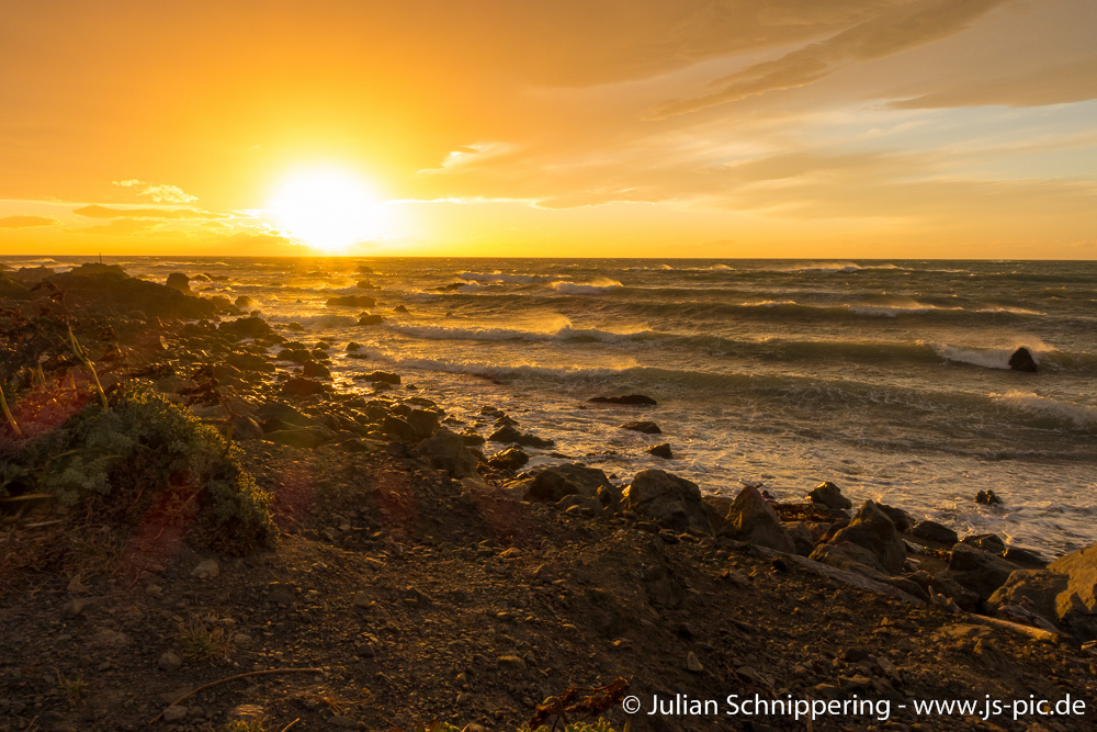 Die Windböen erreichten 50+km/h und machten es einem schwer zu stehen oder zu gehen. Den Abend haben wir daher erneut im vom Wind wackelnden Auto mit Karten spielen verbracht. Der kostenlose Campingplatz liegt direkt am Meer und wir konnten einen wundervollen Sonnenuntergang beobachten!