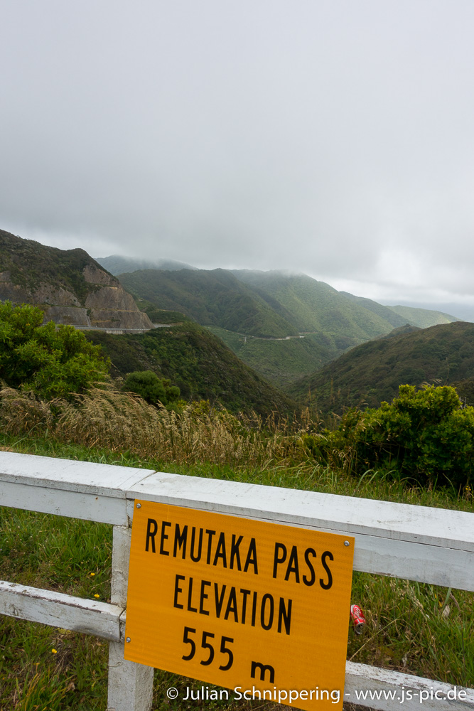 100km waren es bis zum Cape Palliser, der Wind wurde stärker, es fing an zu regnen und die Straße führte uns ins Gebirge. Auf 555m Höhe gab es einen Aussichtspunkt und bei gutem Wetter hätte man mehrere Kilometer über die umliegenden Berge und Täler schauen können. Die Ausläufer des Sturmes verfolgten uns immernoch, sodass wir mit Wolken verhangene Bergspitzen zu sehen bekamen.