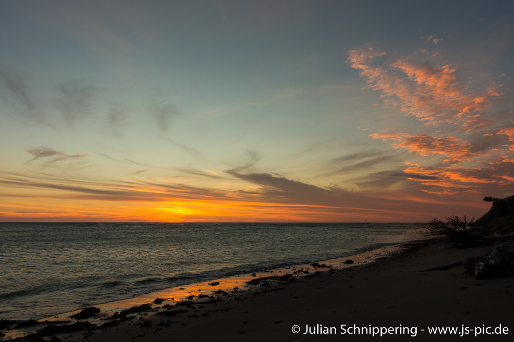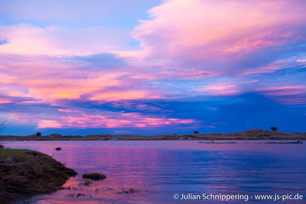 Ohne weiteren Zwischenstopp sind wir danach zu dem Free-Spot auf der Halbinsel gefahren. Direkt an einer Lagune gelegen in einem kleinen Tal, wirklich schön. Am Abend hatten wir einen fantastischen Sonnenuntergang, der Himmel und die vielen Wolken färbten sich in den intensivsten rot, pink, orange und lila Tönen, die wir je beobachten konnten. Dank der Flut, welche die Lagune mit Wasser gefüllt hatte, spiegelte sich der Himmel traumhaft schön auf der Wasseroberfläche. Ein absolut magischer Sonnenuntergang!