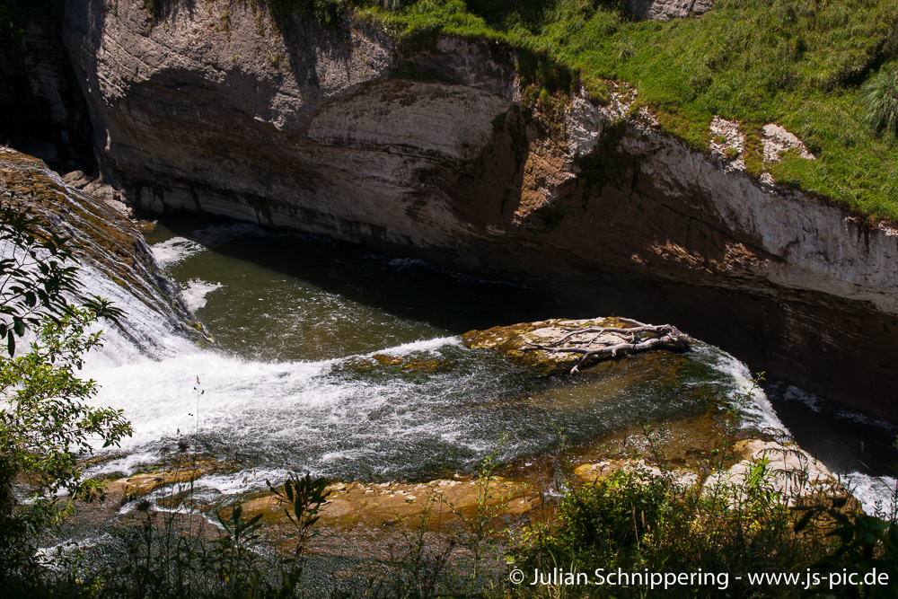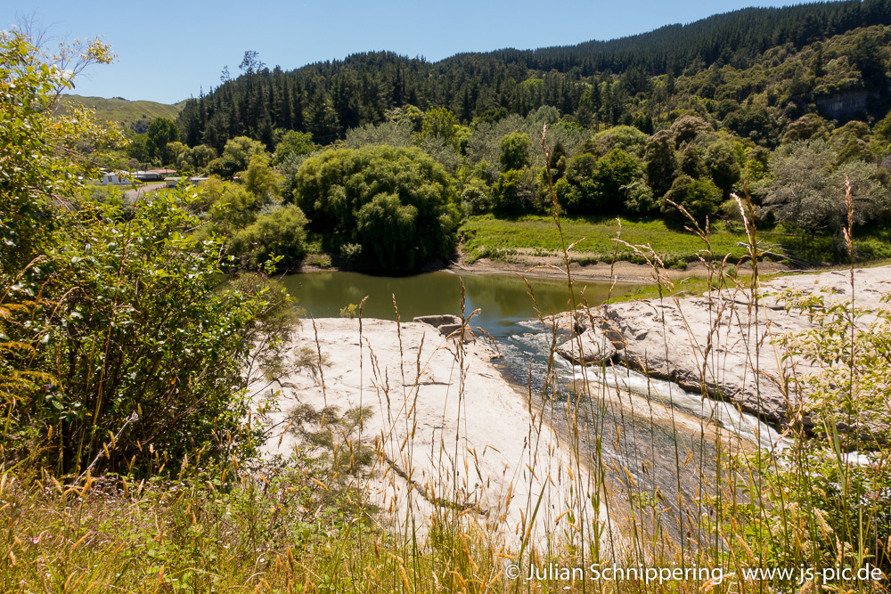 2,5 km weiter die Straße runter haben wir erneut bei den Rere „Wasserrutschen“ halt gemacht. Das Flussbett fällt hier in einer Steigerung ab, welche sich gut zum rutschen eignet, eine natürliche Wasserrutsche sozusagen. Wir hatten weder die passende Kleidung (Neoprenanzug), noch ein geeignetes Bord, aber wir haben hier 5 Mutige angetroffen, die bestens vorbereitet waren. Es war ein heiden Spaß ihnen zuzusehen!