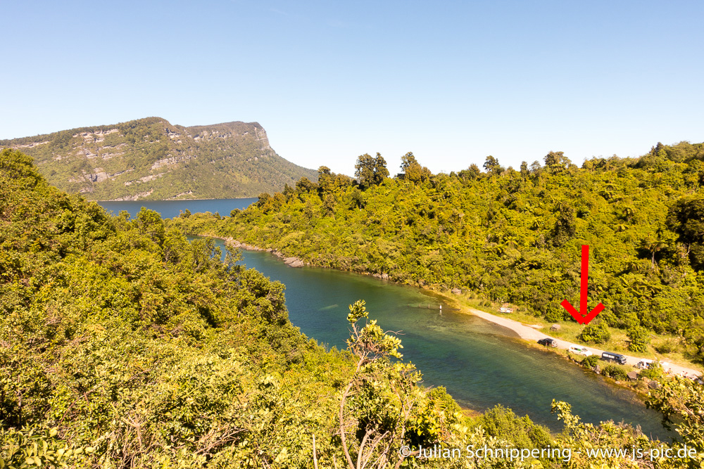 Nachdem wir noch ein wenig die Sonne genossen hatten, ging es weiter zum Lake Waikaremoana. Hier sind neben einem der Great Walks noch zahlreiche kürzere Wanderwege und Campgrounds. Für die erste Nacht haben wir uns für Rosie’s Bay entschieden, der einzige Free-Spot in der Gegend. Gegen frühen Nachmittag erreichten wir den kleinen Campground. Eine kleine Gravelroad die in einem See endet. Am Straßenrand kann man parken oder sein Zelt aufschlagen. Der See ist umgeben von Bergen und Grün, er schimmert blau, türkis bis hin zu grün und ist Kristall klar.