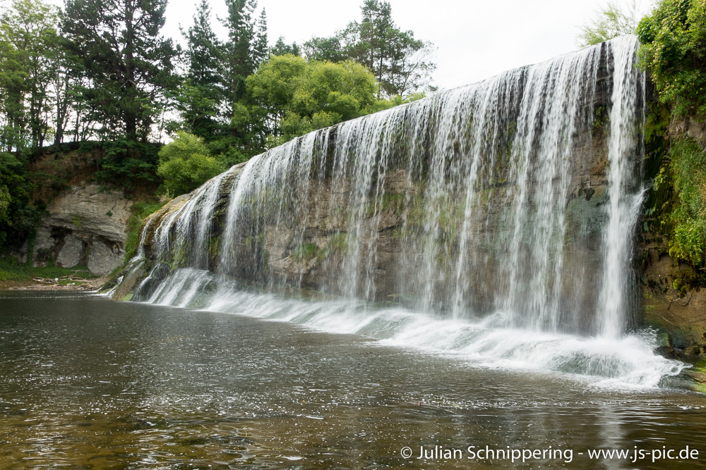 Trotzdem wollten wir noch etwas schlafen und haben uns wieder hingelegt. Um 8 Uhr sind wir erneut aufgestanden, um 10 Uhr haben wir uns auf den Weg nach Gisborne in die Stadt gemacht. Wir wollten uns in der I-Site nach Tageswanderungen erkundigen, zudem mussten wir tanken und einkaufen. Nach dem wir den Vormittag in der Stadt verbracht hatten, sind wir weiter Richtung Mahia Peninsula gefahren. Auf dem Weg haben wir einen kurzen Abstecher zu den Rere Falls gemacht. Mit einer geschätzten Höhe von 6-8 Metern sind dies zwar bei weitem nicht die größten aber die bisher breitesten Falls die wir besucht haben.